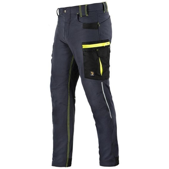 Spodnie wykonane z wysokiej jakości, znanej z odzieży outdoorowej elastycznej tkaniny typu "4-way stretch" o składzie: 90% NYLON, 10% SPANDEX o gramaturze 240 g/m^2. Posiadają wiele funkcjonalnych kieszeni, w tym dwie kieszenie przednie, dwie podwójne kieszenie na udach oraz dwie kieszenie tylne zapinane na rzepy. Ich niezwykle praktyczny krój i elastyczny materiał rozciągający się we wszystkich kierunkach zapewniają maksymalną swobodę ruchów. Wzmocnienia z materiału zabezpieczającego przed przetarciem na nogawkach i kieszeniach. Rygle wzmacniające i potrójne szwy zwiększające wytrzymałość. Przyjemne w dotyku wykończenie wewnętrzne. Sprawdzą się zarówno w pracy, jak i podczas zajęć rekreacyjnych. Nowoczesna kolorystyka i design. Elementy odblaskowe w szwach bocznych i z tyłu. Kolor: grafitowy. Dostępne w rozmiarach 46-60. Pakowanie: 1/20 karton